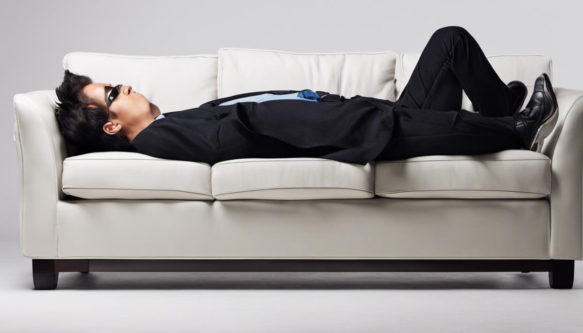 Image of a person sitting on a couch, surrounded by unfinished work, symbolizing the concept of laziness inhibiting productivity.