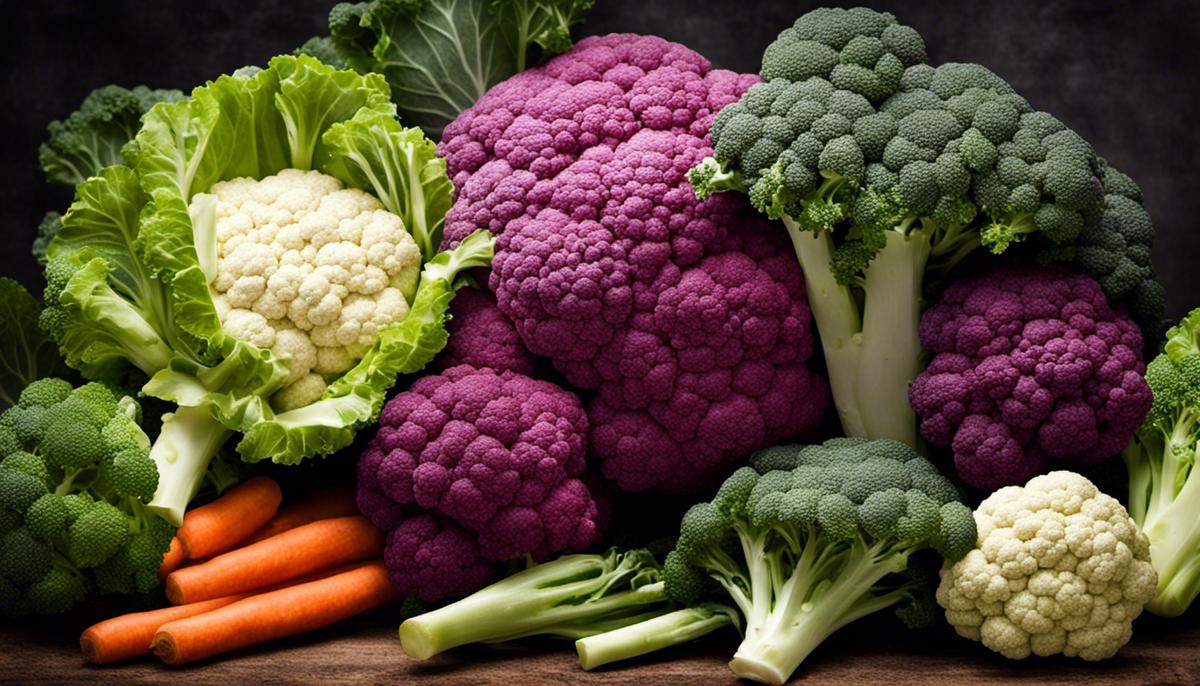 A variety of cruciferous vegetables, including broccoli, cabbage, cauliflower, and kale.